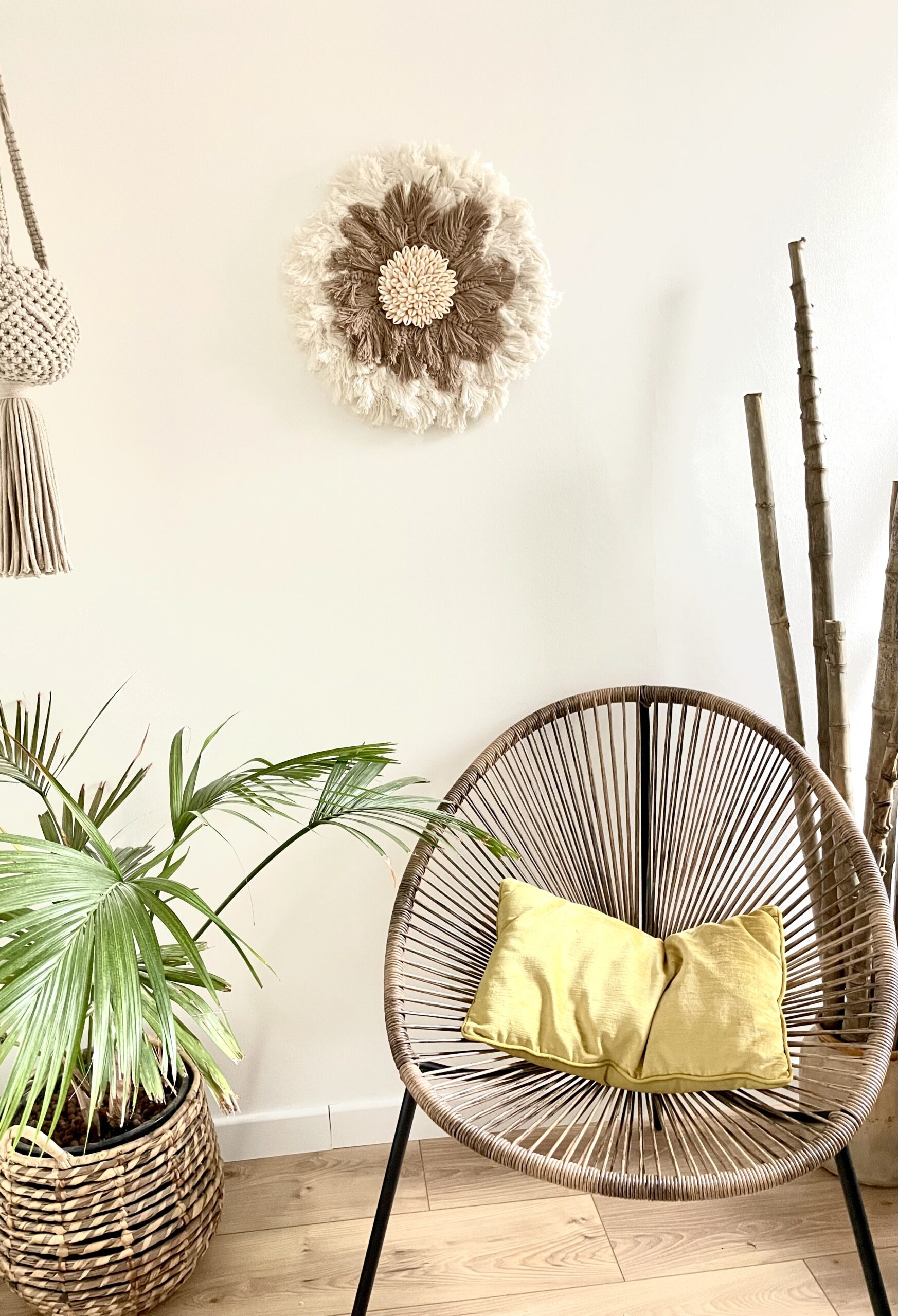Cette décoration murale s’intègre parfaitement dans un intérieur bohème, moderne ou rustique, en apportant une touche de personnalité et de charme artisanal. Polyvalente, elle trouve sa place dans un salon, une chambre ou même une entrée, créant une atmosphère accueillante et apaisante. Fabriqué à partir de matériaux naturels et dans le respect de l’artisanat, ce Jujuhat est une véritable ode au fait main et au design durable.